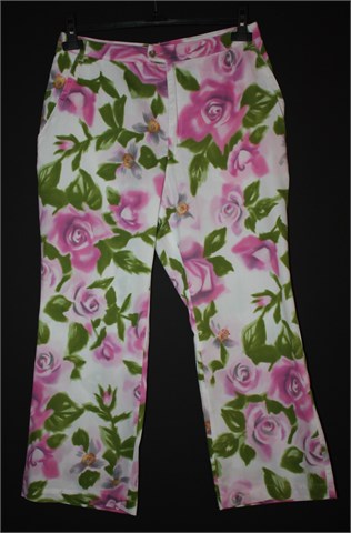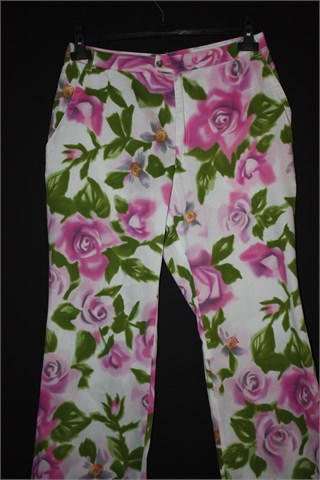 Hlače bijele boje sa cvjetnim printom, dužina je 7/8 (nisu skroz dugačke). Prednji cif i kopčanje, pasica za remen. Prednji bočni džepovi, visoki struk - dublji model.