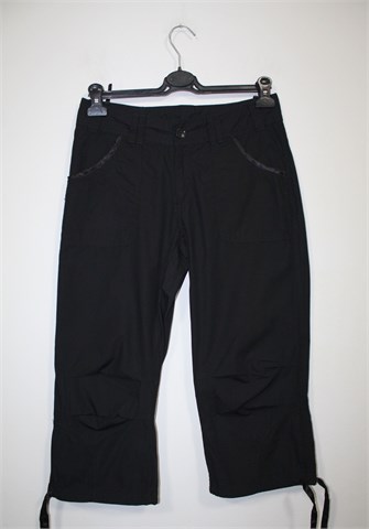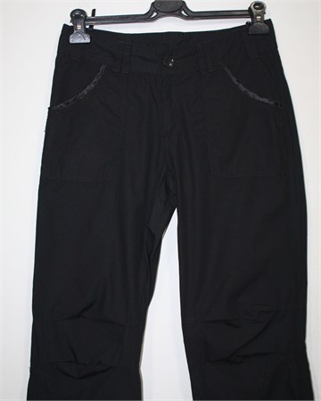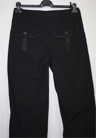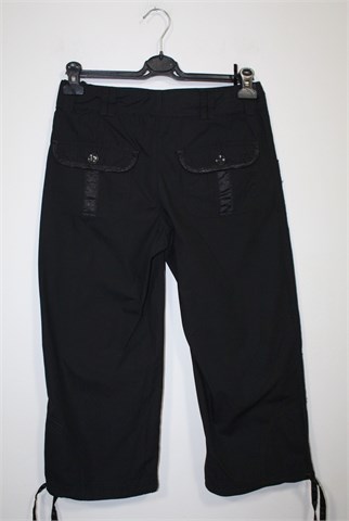 Poluduge pamučne hlače (nešto duže - vidjeti mjere), crne boje. Prednji cif i kopčanje, pasica za remen. Prednji bočni, stražnji džepovi sa preklopom i gumbom (ukrašeni satenom). Trakice za stezanje na dnu nogavica (satenske). Tanji i lagan pamuk.