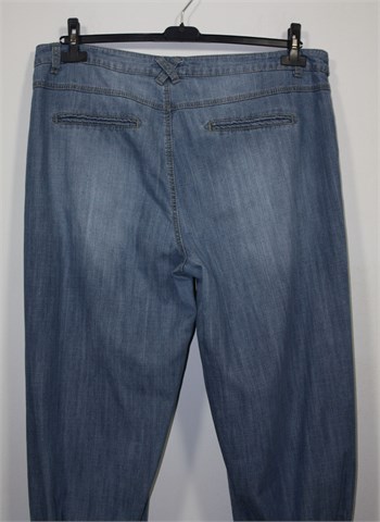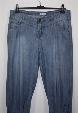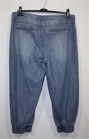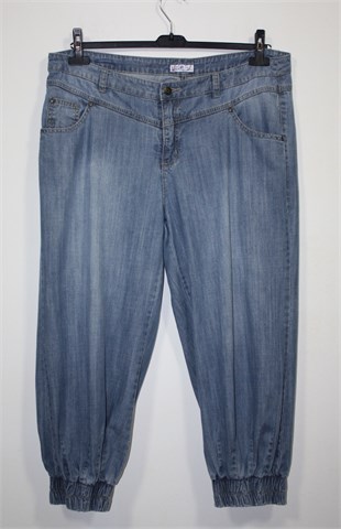 Poluduge traper hlače, svijetli traper mjestimično ispranog izgleda. Prednji cif i kopčanje, pasica za remen. Prednji bočni, stražnji lažni džepovi. Na dnu su nogavice stegnute prošivenim gumicama. Vrlo blago rastezljive.