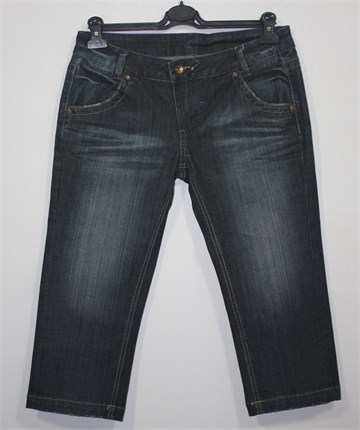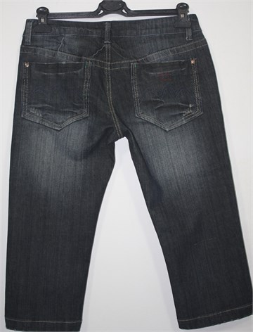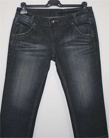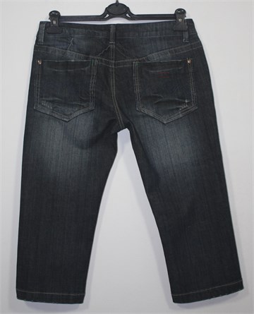 Poluduge traper hlače, tamno plavo-sive boje. Prednji cif i kopčanje, pasica za remen. Prednji i stražnji klasični džepovi (stražnji ukrašeni prošivima od konca). Mjestimično ispranog i iscufanog izgleda (tvornički). Blago rastezljiv materijal.