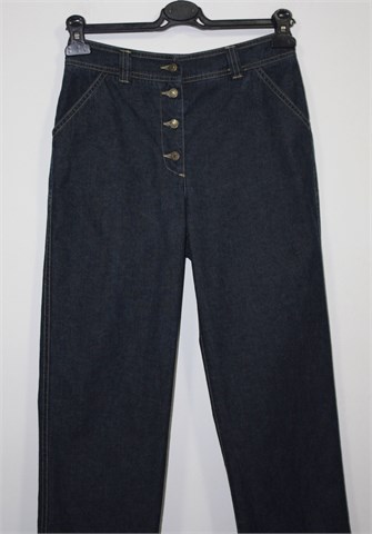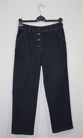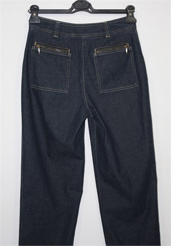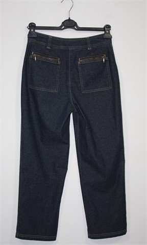 Poluduge traper hlače, tamnije plave boje. Prednje kopčanje, pasica za remen. Prednji bočni, stražnji džepovi sa cifom. Višlji struk, tanji traper.