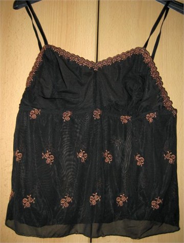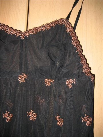 Prilagodljive naramenice. Prozirna. Našiveni ukrasi od smeđeg konca.