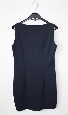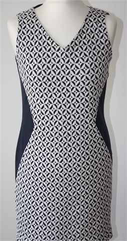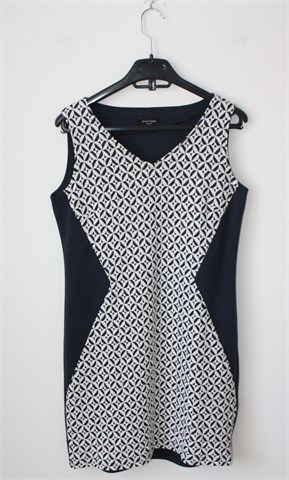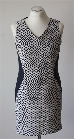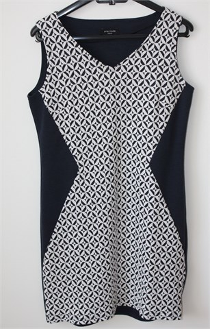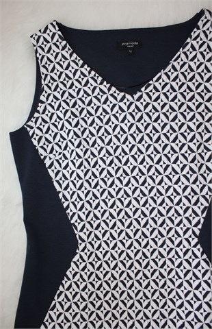 Premoda haljina bez rukava, prednji dio kombinacija plave i bijele, bočni i stražnji dio materijal tamno plave boje. Materijal je srednje debljine, rastezljiv.
