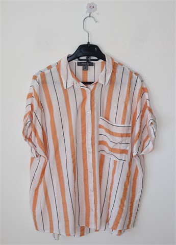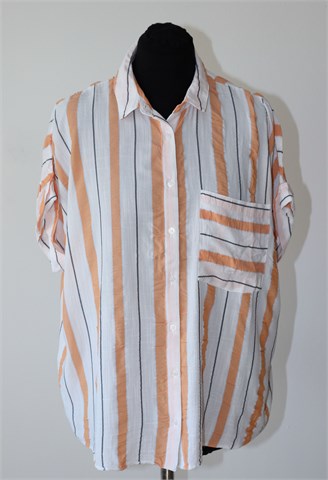 Primark košulja sa kratkim rukavićima, bijele boje sa prugastim uzorkom (boje vidljive na slikama). Džepić na prsima, lagana i blago providna. Nije rastezljiva, malo duža sa stražnje strane.