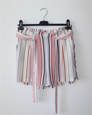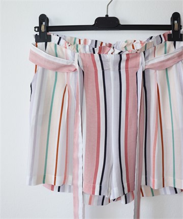 Primark kratke hlače bijele boje sa šarenim prugastim uzorkom (boje uzorka vidljive na slikama). U struku guma (sa stražnje strane pasice) i traka za vezanje/remen, prednji bočni džepovi. Tanke i lagane.