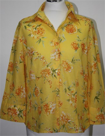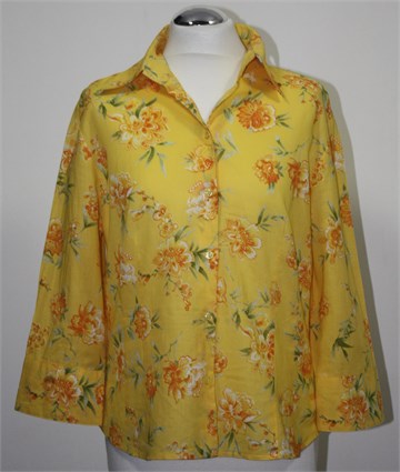 Project košulja sa poludugim rukavima, tamnije žute boje sa cvjetnim printom. Prednje klasično kopčanje, prednji i stražnji ušitci. Lagan i prozračan pamuk.