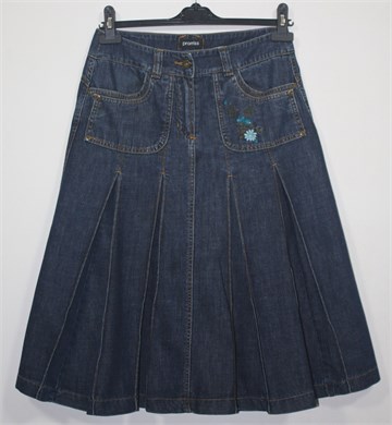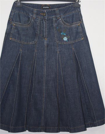 Promiss suknja od trapera, sa faldama. Prednji cif i kopčanje, pasica za remen. Prednji džepovi, ukrasne aplikacije od konca sa prednje i stražnje strane.