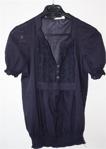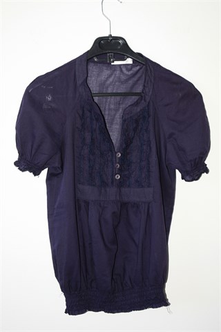 Promod bluza sa kratkim rukavima, tamno zagasito ljubičaste boje. Sa prednje strane gumbići i ukrasni volančići, na krajevima rukava i na pasici stegnuta gumicama. Tanja i lagana, providna.
