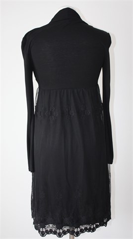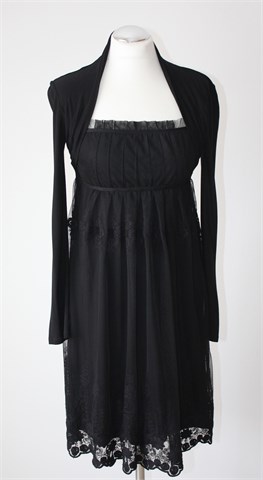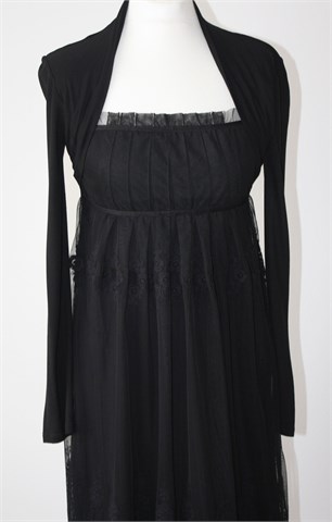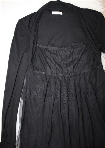 Promod haljina sa dugim rukavima, crne boje. Gornji dio djeluje kao bolero sa rukavima, dio na prsima i vanjski sloj suknje je tilasto-čipkasti materijal (prednja strana i suknja podstavljeni). Iznad i ispod prsiju je našivena gumica (malo se odšila) pa je širina prilagodljiva (vidjeti mjere). Rastezljiv materijal.