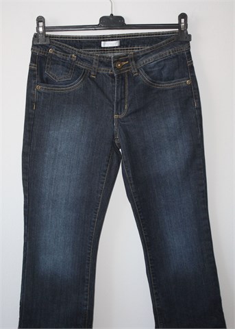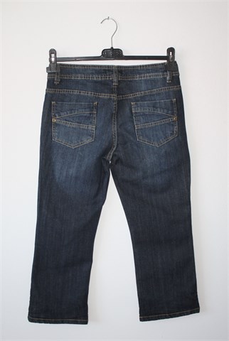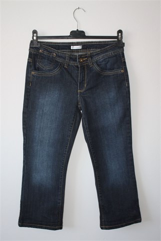 Promod poluduge/capri traper hlače, tamnije plave boje. Prednji cif i kopčanje, pasica za remen. Prednji i stražnji klasični džepovi, nogavice se mogu nositi podfrknute. Blago rastezljive.