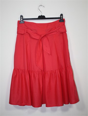 Promod suknja midi dužine, koraljno roze boje. Bočni cif, pasica za remen sa pripadajućim remenom (može se skinuti). Tanji, lagan i prozračan pamuk.