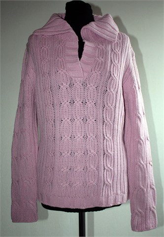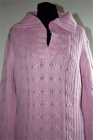 Pulover/vesta roze boje sa dugim rukavima. Duži ovratnik koji se nosi preklopljen (kao na slici). Debelo i rastezljivo pletivo.