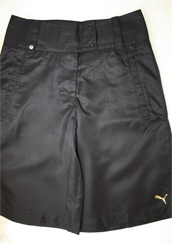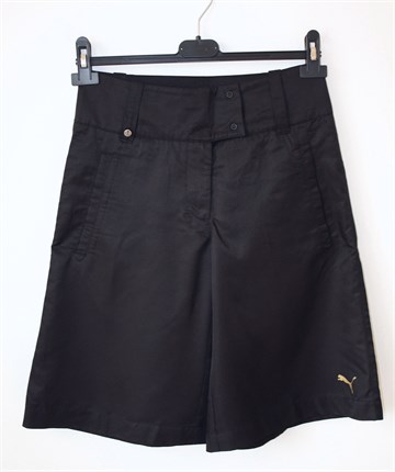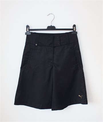 Puma sportske bermude crne boje. Prednji cif i kopčanje na kopčice i gumbe, pasica za remen. Prednji bočni i jedan stražnji džep. Sa stražnje stranice pasice je guma pa je širina blago prilagodljiva (vidjeti mjere). Lagan i prozračan materijal, blago sjajan.