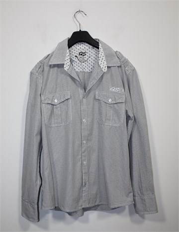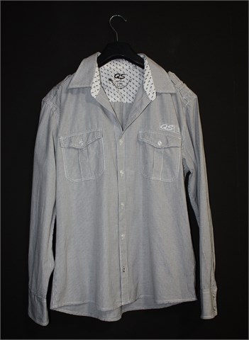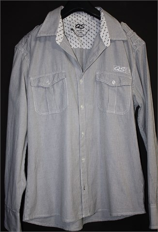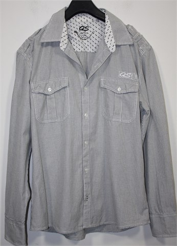 QS by S. Oliver košulja sa dugim rukavima, bijele boje sa sitnim crnim kockastim uzorkom. Prednje kopčanje, na prsima mali džepovi sa preklopom i gumbom. Oznaka modela - extra slim fit.