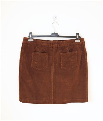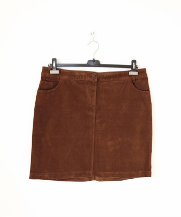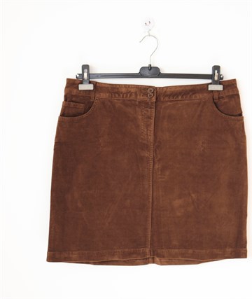 Qiero! suknja od samta smeđe boje. Prednji cif i kopčanje, pasica za remen. Prednji i stražnji džepovi. Rastezljiva.