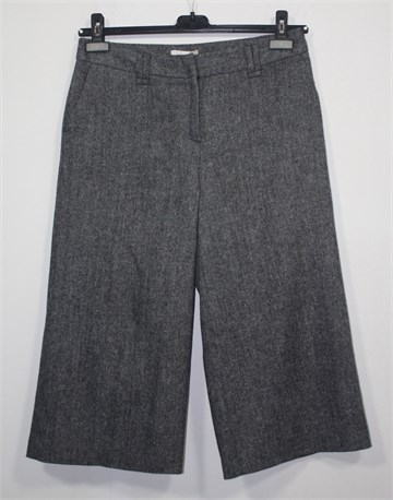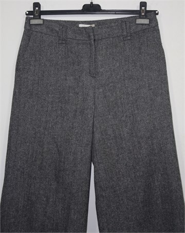 R poluduge hlače od štofa, prošarano crno bijele boje pa djeluju sivo. Prednji cif i kopčanje, pasica za remen. Prednji bočni, stražnji skriveni džep sa gumbom. Tanji ali topli štofasti materijal.
