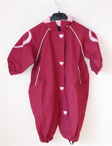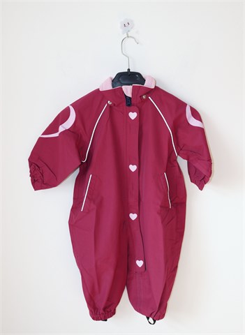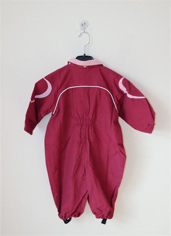 Reflex nepropusni kombinezon/skafander za kišu/snijeg, tamno rozo-crvene boje sa svijetlo rozim detaljima (reflektirajućim). Prednje kopčanje (skriveni cif), bočni džepovi. Oblaći se preko odjeće i obuće pa ima rastezljive gumice koje idu preko cipelica, unutrašnjost-postava je mrežasti tanji materijal (nema debelu podstavu pa se nosi na topliju odjeću). Kapuljača je zagubljena (ne dolazi uz kombinezon).