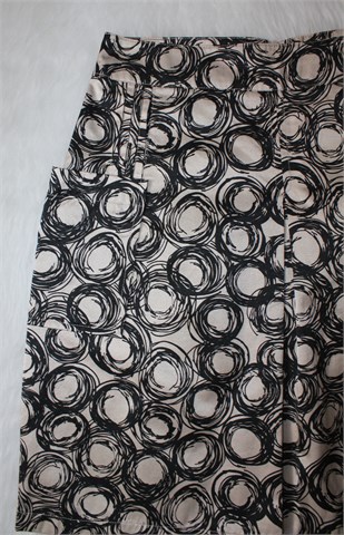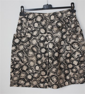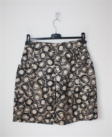 Reflex suknja bež boje sa crnim printom (uzorak printa vidljiv na slikama). Stražnji cif i gumbić, bočni džepovi. Falda sa prednje strane. Materijal je nerastezljiv i blago sjajan.