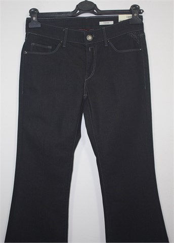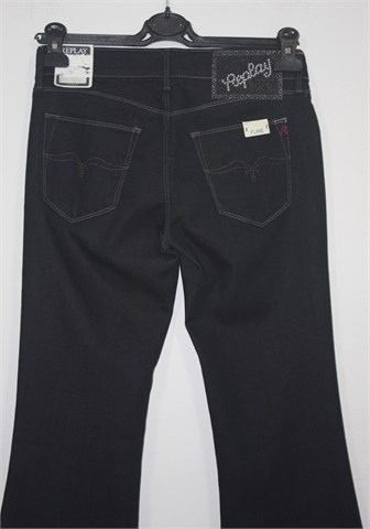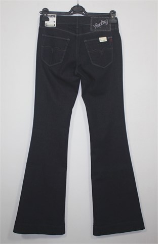 Replay traper hlače od tamnog trapera, model se zove TEENA - flared (šire, trapezaste nogavice). Hlače imaju prednji cif i kopčanje, pasicu za remen. Prednji i stražnji klasični džepovi. Svi šavovi su sive boje, na stražnjim džepovima tamno sive aplikacije od konca. Aplikacija i kod prednjeg lijevog džepa. Na stražnjoj strani pasice Replay blago šljokava etiketa. Blago rastezljive.