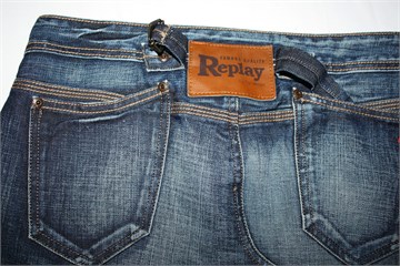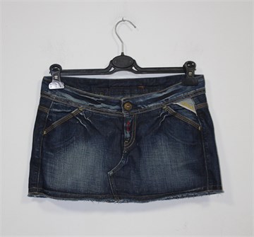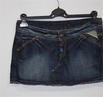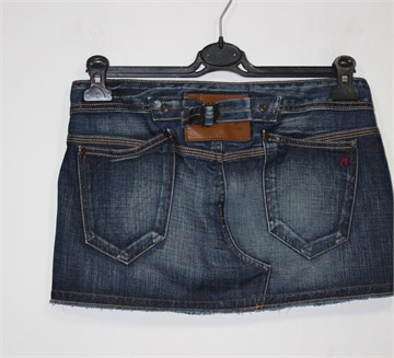 Replay kratka traper suknja, tamnije plave boje mjestimično ispranog i iscufanog izgleda (used look). Prednji cif i kopčanje, pasica za remen. Prednji i stražnji džepovi, Replay etiketa između stražnjih džepova. Ocufani rub (porubljeno), nešto je duža sa stražnje strane (vidjeti mjere).
