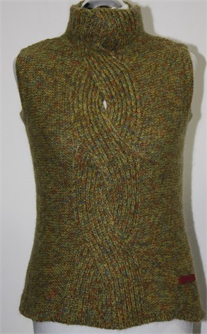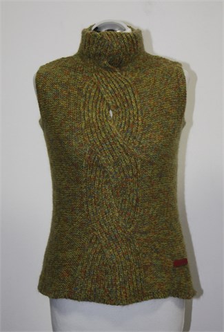 Respect vesta bez rukava/dolčevita prošarano zelene boje. Sa prednje strane uzorak pletenice. Pletivo srednje debljine, mekano, mucasto i rastezljivo.