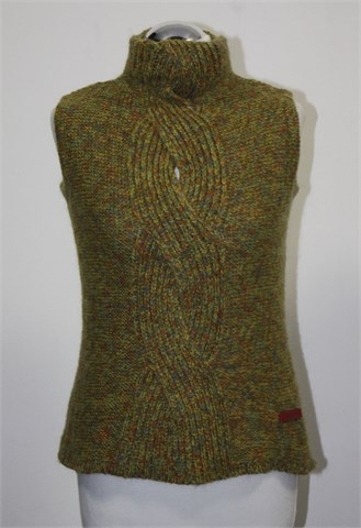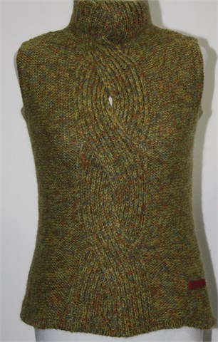 Respect vesta bez rukava/dolčevita prošarano zelene boje. Sa prednje strane uzorak pletenice. Pletivo srednje debljine - mekano, mucasto i rastezljivo.