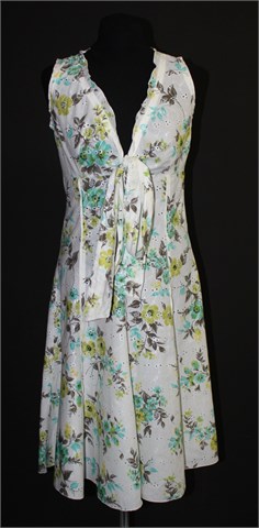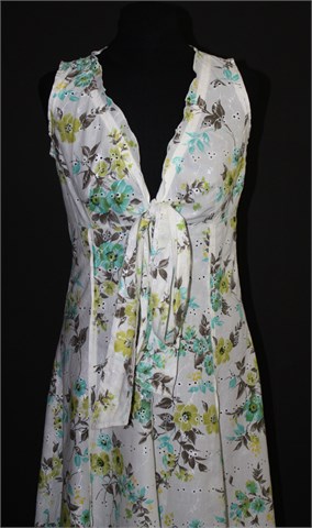 Retropol haljina bez rukava, bijele boje sa cvjetnim uzorkom i prošivima od bijelog konca. Materijal je mjestimično rupičast. Vezanje sa trakama sa prednje strane, bočni cif. Vrlo lagan i prozračan pamuk.