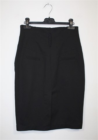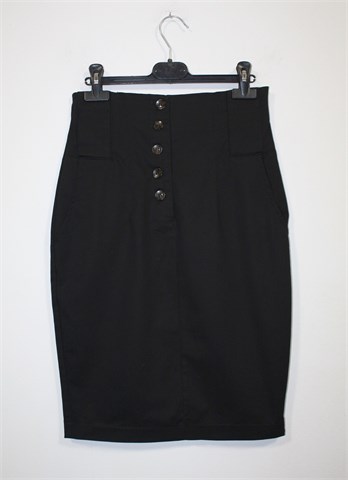Rinascimento suknja sa visokim strukom, crne boje. Prednje kopčanje, bočni džepovi. Šira pasica za remen, stražnji rasporak (na sredini). Blago rastezljiva.