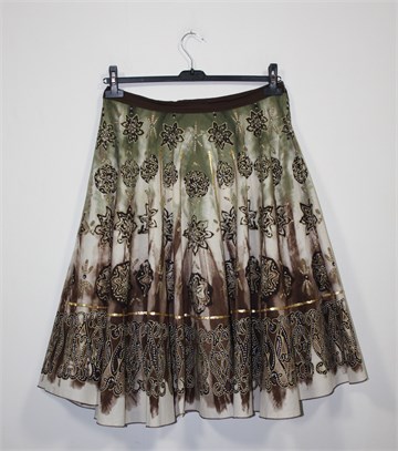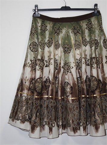 Rinascimento prekrasna suknja sa šarenim printom i mjestimičnim našivenim zlatnim šljokicama sa prednje strane. Bočni cif, suknja je krojena kao puni krug.