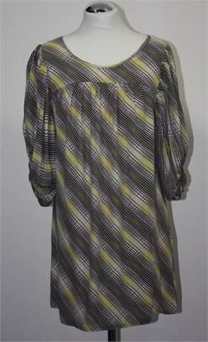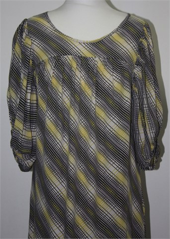 River Island duža bluza/tunika sa širim puf rukavima, vrlo neobičnog i lijepog kroja. Bijele boje sa printom/uzorkom u kombinaciji žute, sive i crne boje (uzorak kao na slikama). Šira i prozračna, oversized model. Bočne ušice za remen (bez remena).