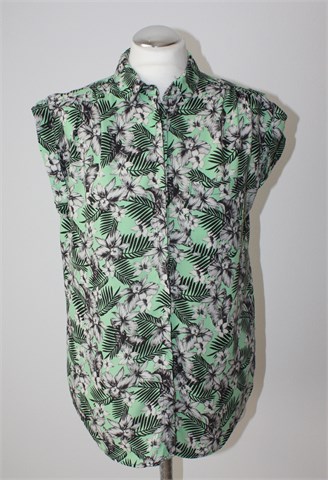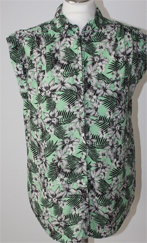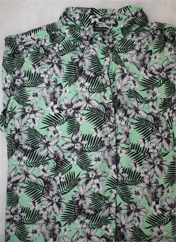 River Island košulja sa malim rukavićima svijetlo zelene boje i printom ( boje i uzorak printa vidljivi na slikama). Prednje skriveno kopčanje, mali džepić na prsima. Duža sa stražnje strane (vidjeti mjere), nije rastezljiva.