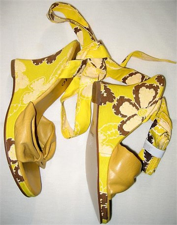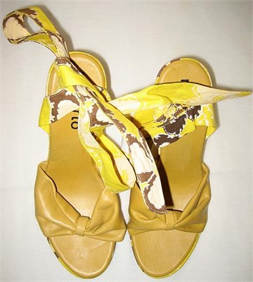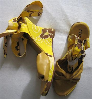 Izvana imitacija kože. Trakica za vezanje oko gležnja i peta presvučeni tkaninom cvjetnog uzorka. Nove, nenošene.