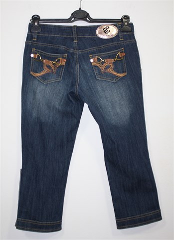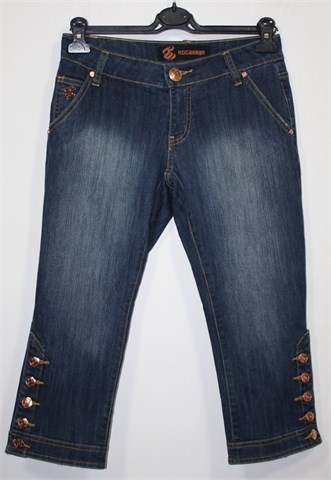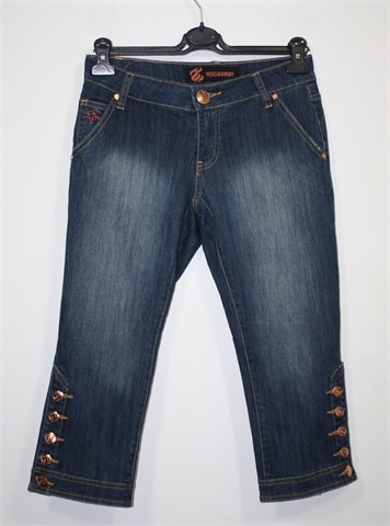 Rocawear poluduge traper hlače, srednje plave boje mjestimično ispranog i iscufanog izgleda (tvornički used look). Prednji cif i kopčanje, pasica za remen. Prednj i stražnji džepovi (stražnji sa ukrasnim prošivima i ukrasima). Odličan, rastezljivi traper, super se prilagođavaju tijelu.