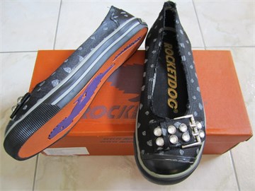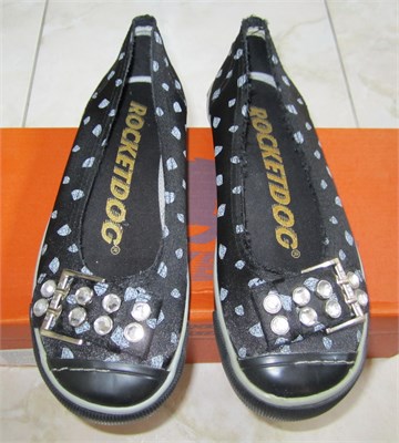 Rocket dog balerinke/tenisice crne boje sa uzorkom dijamantića u srebrno-sivoj boji. Sa prednje strane kapica od gume i ukrasna kopča ukrašena cirkonastim gumbićima. Sa stražnje strane prišivak sa Rocket dog logom i Rocket dog natpis u sivoj boji.