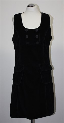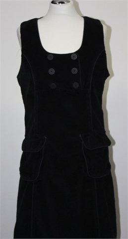 Rosalita McGee haljina od samta crne boje, bez rukava. Bočni džepovi sa gumbima, ukrasni gumbići na prsima. Deblji samt, haljina je podstavljena.