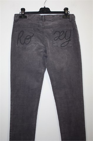 Roxy hlače od samta sive boje, skinny model. Prednji cif i kopčanje, pasica za remen. Prednji i stražnji džepovi (stražnji s aplikacijom Roxy - vidljivo na slikama). Regulacija širine struka unutar pasice (bočne gumice sa gumbićem). Mekane i rastezljive.