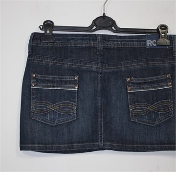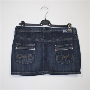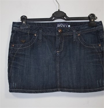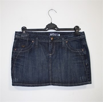 Roxy kratka traper suknja, srednje plave boje mjestimično ispranog i iscufanog izgleda (used look). Prednji cif i kopčanje, pasica za remen. Prednji bočni, stražnji klasični džepovi (prošiveni ukrasima od konca). Nije rastezljiva, traper klasične debljine.
