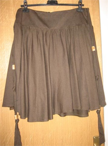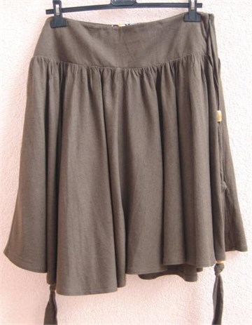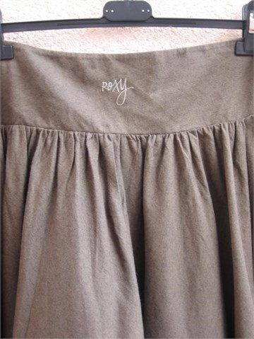Prekrasna Roxy suknja, boja je nešto između maslinasto zelene i smeđe boje (ili Cookie Crisps kako piše na etiketi). Suknja je vrlo lagana i lepršava, podstavljena cijelom dužinom. Sa stražnje strane našiven natpis Roxy od konca. Na suknju je našiven remen sa plastičnim kuglicama. Slike su sa i bez blica, teško je dočarati boju ali najbliži opis bi bio topla smeđa boja :)