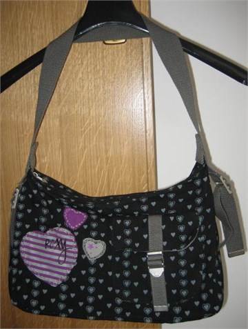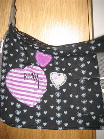 Preslatka pamučna Roxy torbica manjih dimezija, crne boje sa printom sivih srčeka po cijeloj torbi. Sa prednje strane prišivci (srčeka) u ljubičasto-sivoj kombinaciji. Ručke i podstava sive boje. Prednji džepić, iznutra jedan pretinac i džepić za mobitel. Zatvaranje na cif.
