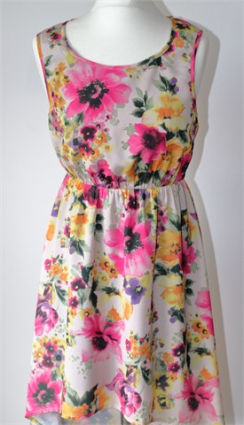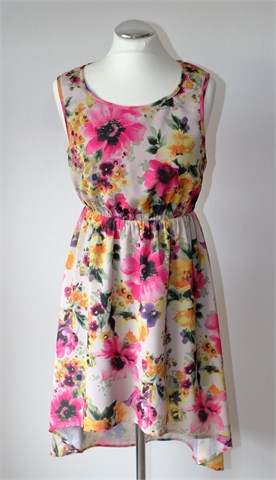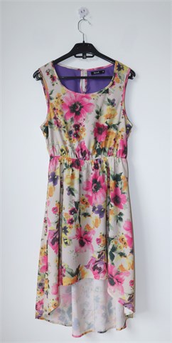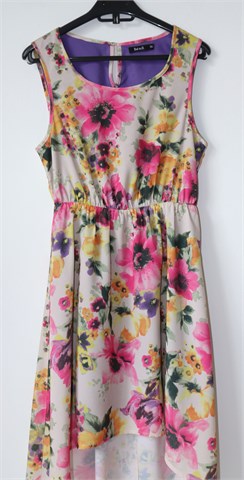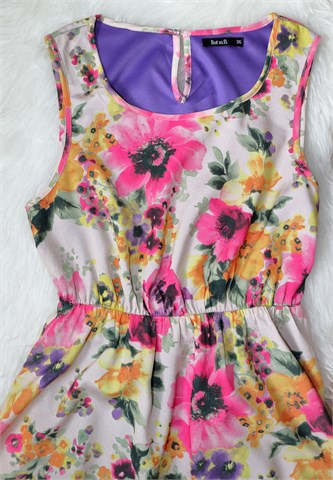 Rut m.fl. haljina bez rukava sa cvjetnim printom (boje i uzorak printa vidljivi na slikama). Gumbić na vratu, gumica u struku. Podstavljena ljubičastom podstavom, rastezljiva. Duža sa stražnje strane (vidjeti mjere).