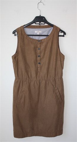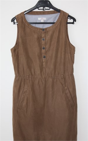 S. Oliver haljina/tunika svijetlo smeđe boje (materijal djeluje kao brušena koža / sastav materijala je poliester). Sa prednje strane djelomično kopčanje, u struku gumica i ušice za remen, bočni džepovi. Podstavljena, nije rastezljiva.