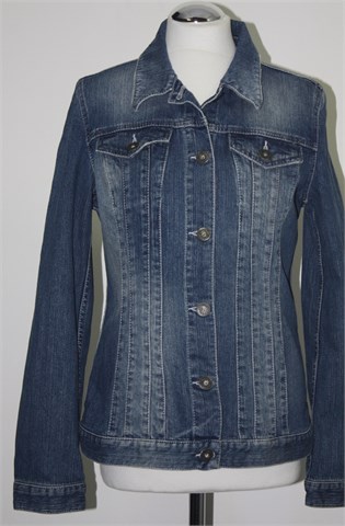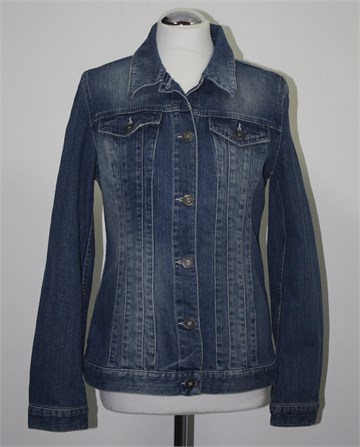 S. Oliver jakna od trapera, srednje plave boje mjestimično ispranog i iscufanog izgleda. Prednje kopčanje, mali džepovi na prsima. Vrlo blago rastezljiva.