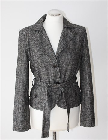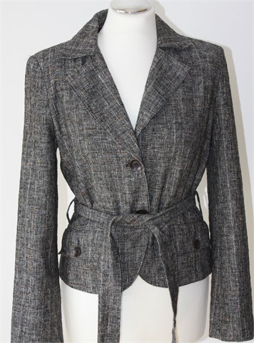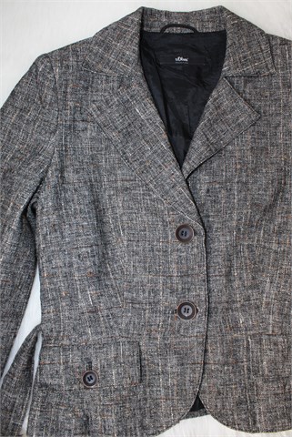 S. Oliver sako/jakna prošarano crno-bijele boje sa upletenim nitima u raznim bojama (smeđim, bež, plavim). Prednje kopčanje, mali bočni džepovi sa gumbom. Jastučići u ramenima, podstavljen (na par mjesta podstava je oštećena ali ne smeta kod nošenja). U struku remen od istog materijala (može se skinuti).