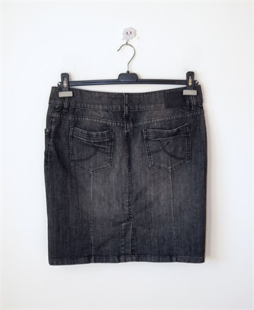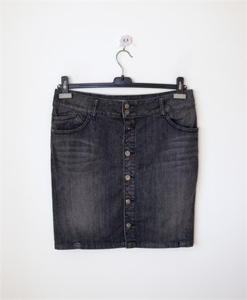 S. Oliver traper suknja tamno sive boje/used look. Prednje kopčanje (sa tri gumba, ostatak su ukrasni), pasica za remen. Prednji bočni, stražnji klasični džepovi. Sa stražnje strane rasporak (mali, po sredini), suknja je rastezljiva.