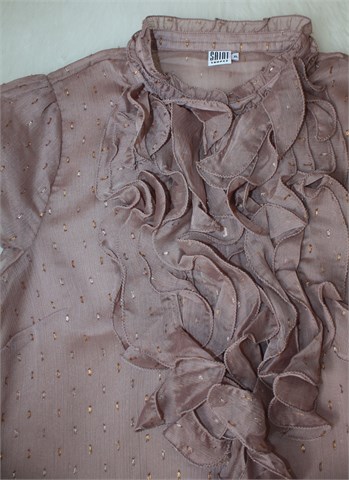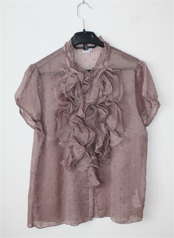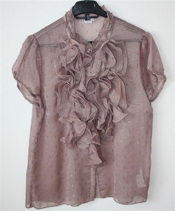 Saint Tropez košulja sa kratkim rukavima, tamnije prljavo rozo-lila boje sa uzorkom na materijalu (vidljivo na slikama, uzorak zlaćano-srebrne boje). Prednje kopčanje, oko kopčanja volančići sa obje strane. Tanka i lagana, providna. Blago rastezljiva.