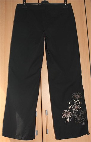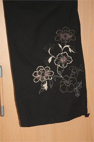 Casual hlače crne boje, cvjetna aplikacija na dnu nogavice. Prednji bočni džepovi, otraga jedan džepić. Šire nogavice. Prednji cif i kopčanje, pasica za remen.