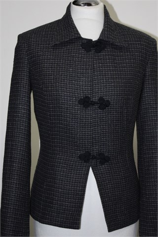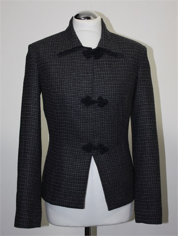 Profesionalno šivan sako/kratki kaputić prošarano sive boje, materijal je štof. Prednje kopčanje sa ukrasnim "gumbima" od trakica, strukirana. Blagi jastučići u ramenima, podstavljen.