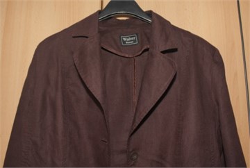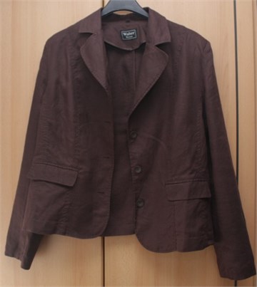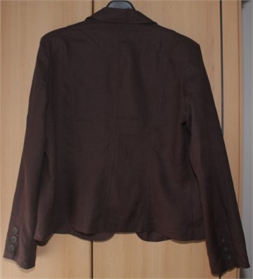 Lanena jaknica/sako tamno smeđe (čokoladne) boje. Prednje kopčanje i džepovi. Jastučići na ramenima (lako se skinu) i blago strukirana. Veličina piše 46 (vidjeti mjere).