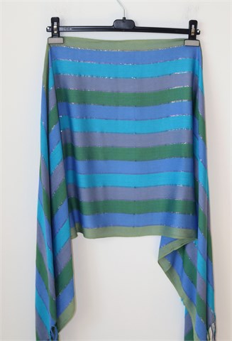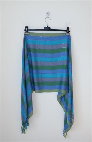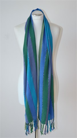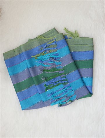 Šal/pašmina u kombinaciji plave i zelene boje, mjestimično protkan sjajnim nitima.