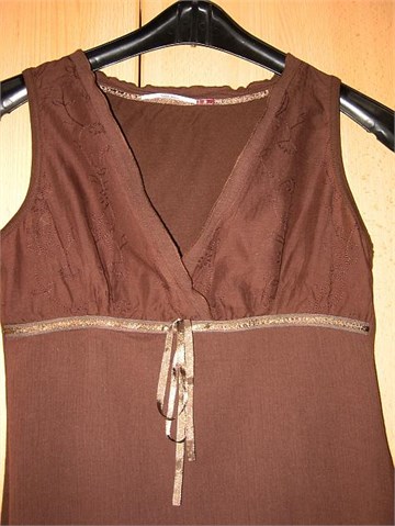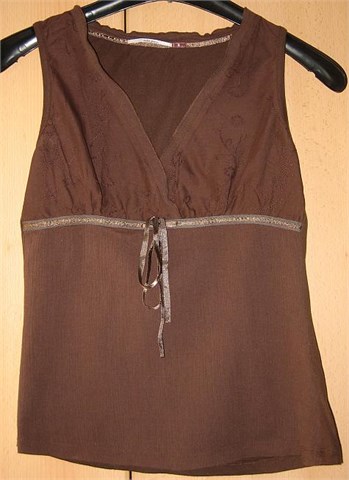 Bez rukava. Prednja strana materijal kao košuljica, leđa običan pamuk. Dekoltirana, ukrasna sjajna vrpca. Na grudima na tkanini izvezene aplikacije od konca. Rastezljiva. Na majčici piše veličina S.